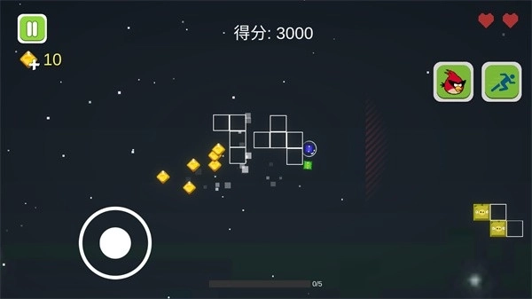 3、游戏中会出现大量方块,你得灵活地进行躲避,并且还要迅速将方块猪发射到空白方块的位置,只要有三个相同颜色的小猪凑在一起就能完成消除,这样你也能相应地获得分数。