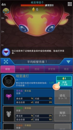 2、通过升级螃蟹能够提升攻击伤害,也可以对螃蟹进行进化,不同进化效果各有差异,同时还有多样炫酷的技能可供使用;