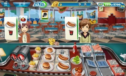3、随着玩家持续解锁关卡,会获取更多新的食材与道具,同时也会愈发手忙脚乱。这里给大家分享一个小技巧:不少客人会选择点套餐,而套餐里只要上了其中一道食物就能延长顾客的等待时间,所以可以提前准备一些饮品,用来增加顾客的等待时间。