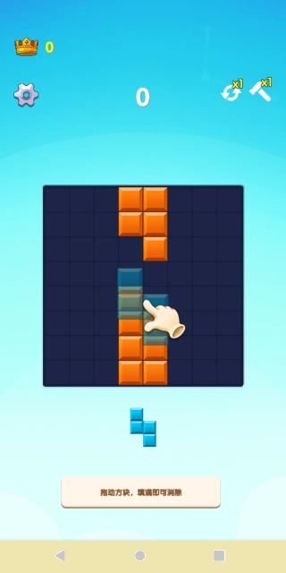 消除机制:若某一水平行或垂直列被方块完全填满,系统会自动消除该行或该列并计入分数,此时位于被消除行/列上方的方块将同步向下移动,从而为后续操作创造连续的空间。