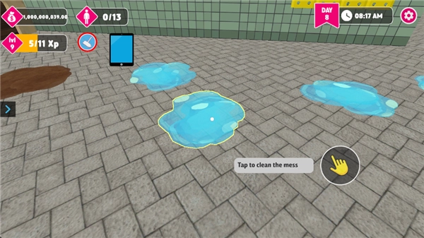 玩家刚进入游戏时,需要移动到场景里,点击清理那些脏乱的地面。