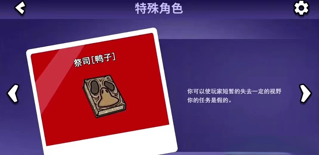 1、祭司是鸭子阵营的职业,技能可以使一名玩家失去一定的视野,你的任务是假的;