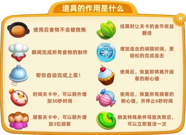 在《小镇大厨》这款游戏里,准备了各种各样的道具可供大厨挑选,这些道具能够辅助大厨更顺利地通关,并且帮助他们获取更高的收益。