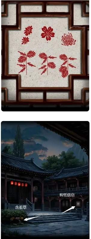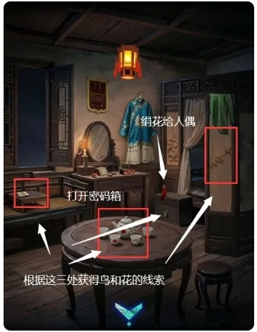 10、依据屋内桌面、榻上以及屏风上所绘制的7花4鸟图案,解开人偶坐着的箱子,获取药包,与此同时,将之前得到的绢花交给人偶。