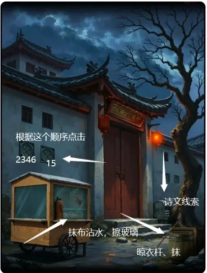 1、在左侧大树下方找到抹布和晾衣杆,用抹布蘸取小推车上的水后,能够擦去玻璃上的污渍,露出左边月亮、右边太阳的图案;接着用湿抹布擦拭大门口的石碑,可看到一段文字,按照文字提示点击墙上的按钮,墙壁上的砖块会脱落,从而得到钥匙。