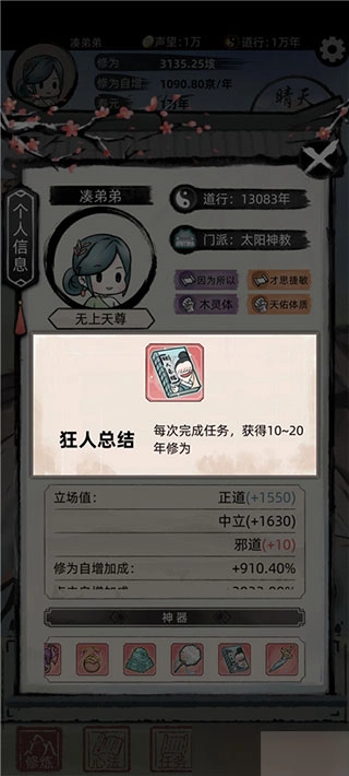 游戏采用挂机放置的玩法设计,只需轻松点击,就能让角色进入修炼状态。