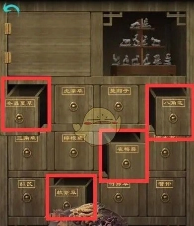 6.调整经书房间的柜子如下图,根据书的提示摆放右边的棋子,如图所示,在翻转的门后获得药方和【木盘】,用木盘在药柜钱根据药材药方抓药【冬虫夏草、雀梅藤、软紫草、八角莲】,将抓好的药材放到旁边炉子里,倒入清水