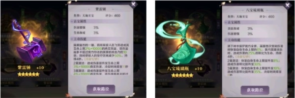 前期可以先出紫雷锤,等后续解锁天道之力后再换上八宝琉璃瓶——它既能提供治疗效果,又带有吸血属性,毕竟只有保证生存,才能实现持续输出。