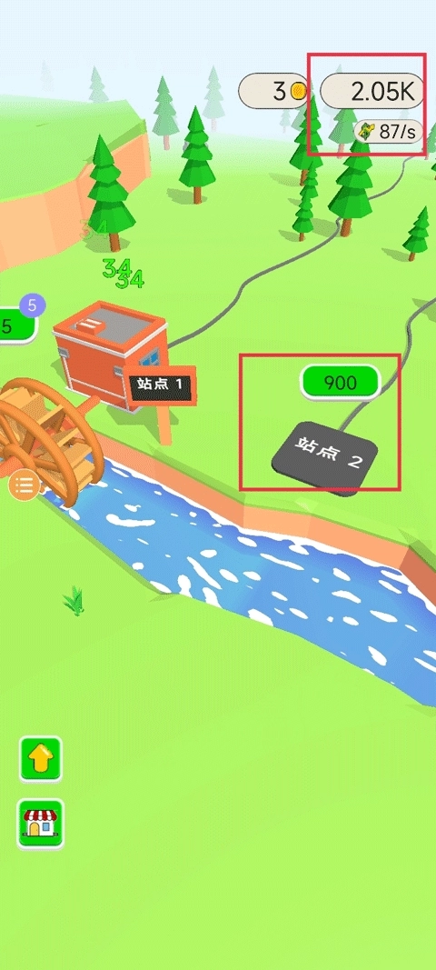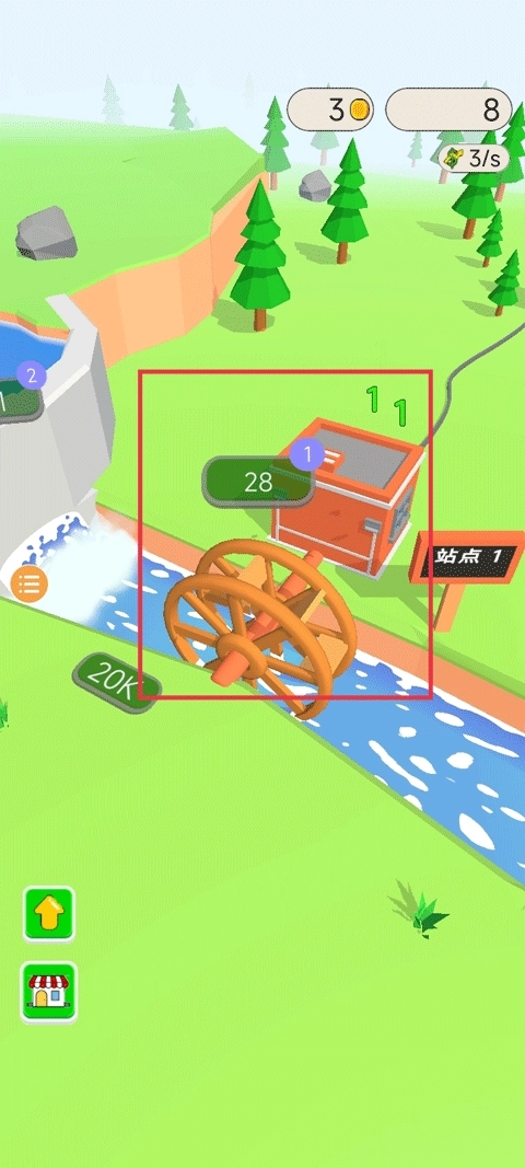 1、启动游戏后,第一步点击绿色的“2”按钮,即可立即建造一座水力发电机。