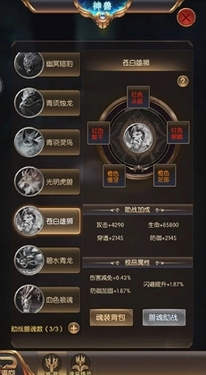 进入神兽界面后,我们会看到许多神兽,要召唤它们就得集齐对应的魂装。每套神兽魂装包含5个部件,分别是头部、躯干、眼睛、獠牙和足部。