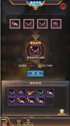 除了击杀boss能掉落魂装外,还可以借助魂装铸造来合成更高级的魂装,合成规则是四件同等级的魂装——也就是同为紫装或者橙装——能够合成下一级的高级魂装。