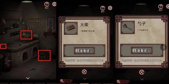 14、再来到厨房,拾取“勺子”、“火柴”和“木材”。