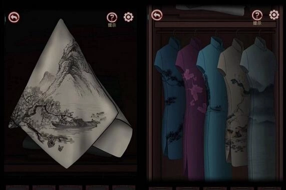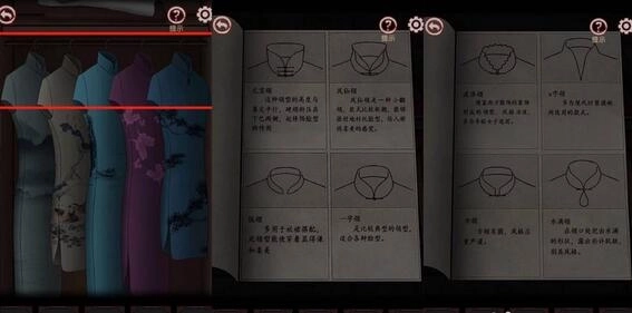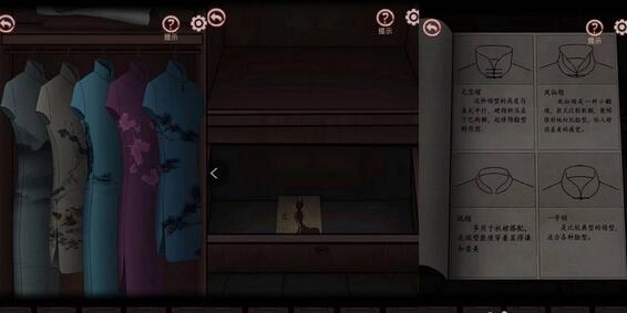22、再手绢上发现一格图案,并将旗袍按照此图案进行排列,就会将旗袍下面的抽屉打开并获得一本关于旗袍领子样式的册子。