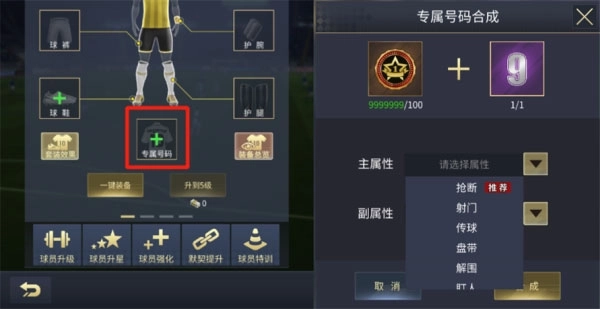 当我们看到某个号码,脑海里总会浮现出球员在球场上驰骋的模样——现在,你也能为麾下的球员挑选专属号码了!只需在装备界面点击人物下方的方框,就能完成号码设定。定制专属号码时,除了需要心仪的号码道具,还得搭配专属证明进行合成,同时可以自由选择契合自身需求的属性。而这些合成所需的材料,都能从接下来要介绍的“巅峰对决”玩法中获取。