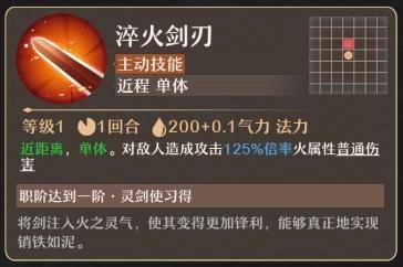 淬火剑刃(主动技能):近距离单体技能,对目标敌人造成基于自身攻击力125%倍率的火属性普通伤害。