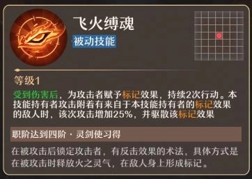 飞火缚魂(被动技能):承受伤害后,会给攻击者施加标记效果,该效果持续2次行动。当技能持有者攻击带有自身施加的标记的敌人时,此次攻击伤害提升20%,同时清除该标记。