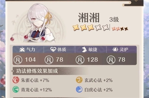 ②功法修炼效果:每个弟子都具有十分独特的功法加成数值,其主要反映在修炼成长数值增长。如湘湘的青龙、朱雀属性成长十分显著,这驱使她的流派定位为输出,因为青龙主属性为敏捷,朱雀主属性为气力。具体的属性加成的具体数值可继续食用下文。