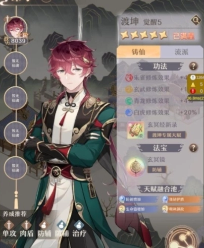 首先来看相性方面,在铸仙之境手机版里,站场型前排最适合走的培养路线就是土系御剑流派。这是因为土系御剑的技能大多带有防御加成和嘲讽效果,部分技能还能依据防御属性来提高伤害输出,算是前排弟子中与防御属性关联最紧密的类型。而渡坤这个弟子拥有全角色里最高的20%土系效果增幅,同时还有20%的御剑效果加成,完全就是为土系御剑流派量身打造的存在。