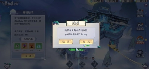 3、禁地采撷部分用于重置挑战次数或是结算奖励翻倍。