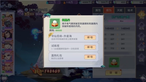 修为则是通过服用修为丹药来进行修为等级和属性的提升。