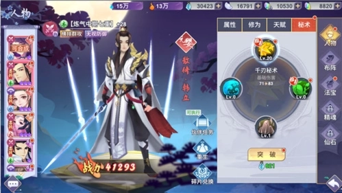 最后一个是秘术通过消耗灵气来提升属性,这个和其他的不同,秘术一共有四种属性可以选择,伤害,体质,物防,法防。这个建议根据伙伴定位进行选择,例如韩立这个群攻妥妥的就选择伤害了。灵气可以购买也可以通过各种活动玩法获得,获得方法简单。