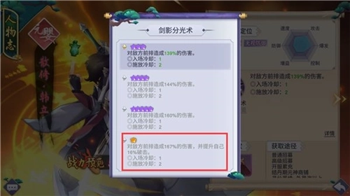 当然了,容易获得只是一方面。在技能方面散修.韩立的主动技能剑影分光术能够对前排造成大量的伤害,在角色星级提升后,还能够提升自己的破击率。作为一个输出角色,这个技能中规中矩,但是搭配上他的获得难度,还是比较推荐使用的。