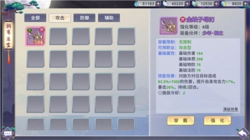 通用法宝则比较简单,需要通过秘境寻宝玩法获得图纸和材料,然后再通过炼器玩法炼制。和专属法宝相同,通用法宝也能够带来属性和专属技能。只不过每个角色都可以使用,并无使用限制。当然了,法宝方面还是建议攻击法宝给输出角色使用,防御法宝给肉盾使用,辅助法宝给奶妈和辅助角色使用。毕竟物尽其用才是好的嘛。