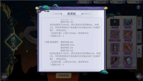 推荐使用辅助法宝封灵柱。能够在血量低于70%时,提升自身防御,同时获得最大生命值40%的全能护盾。