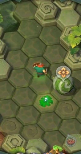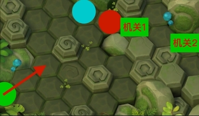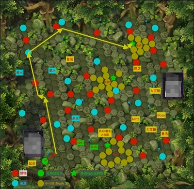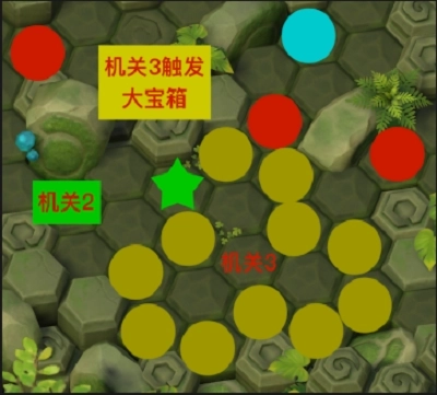 这幅图是NPC、资源、怪物与Boss的分布图,其中红色圆圈是怪物,蓝色圆圈是资源,绿色圆圈是可移动石头,这个石头是本图的关键,用来解锁三个石头阵,如图。