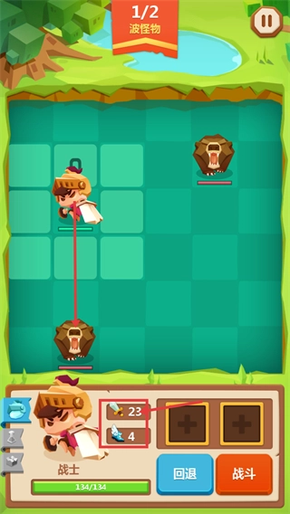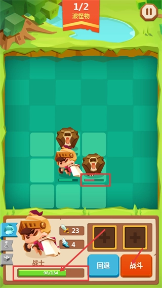 战斗时留意【1/2-波次怪物】,借助战士【23点攻击】【4点速度】的属性,观察怪物布局后伺机发起进攻。
