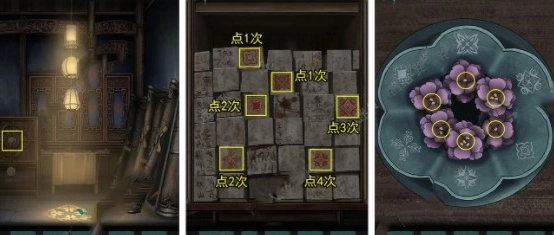 11、打开柜子,参照花瓶提示,点击相应图案的骨灰盒(花朵数量代表点击次数)。
