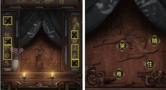 6、根据挽联提供的信息,操作浮雕机关,获得【桃木剑】和【钥匙】。