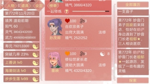 一个人能够为你引荐父母(2位)、师尊(1位)、好友(2到5位)、道侣(1位),还能捡到徒弟(看脸,数量不限),孩子出生后会直接与你相识(最多3个);若你担任特殊职位,还可介绍同门中的特殊职位人员(1到5个以上)。