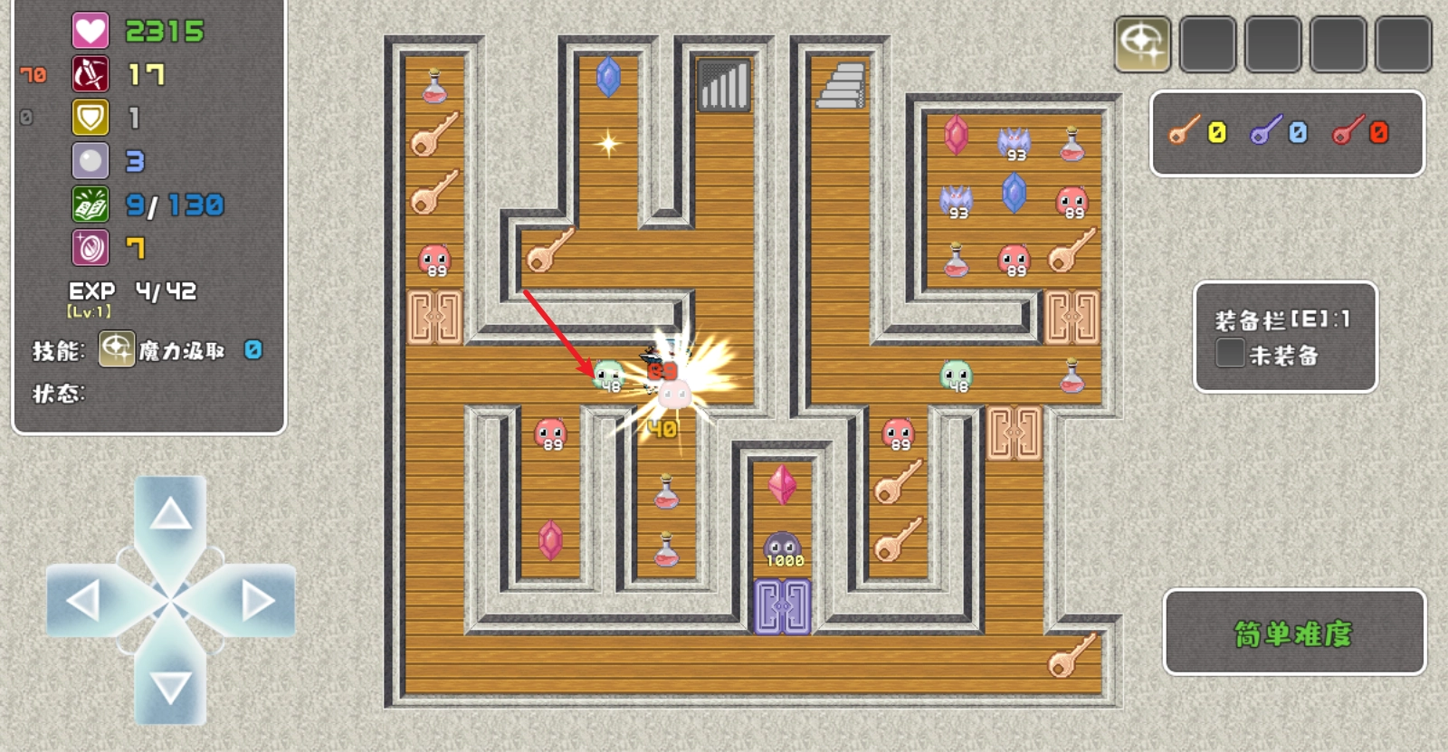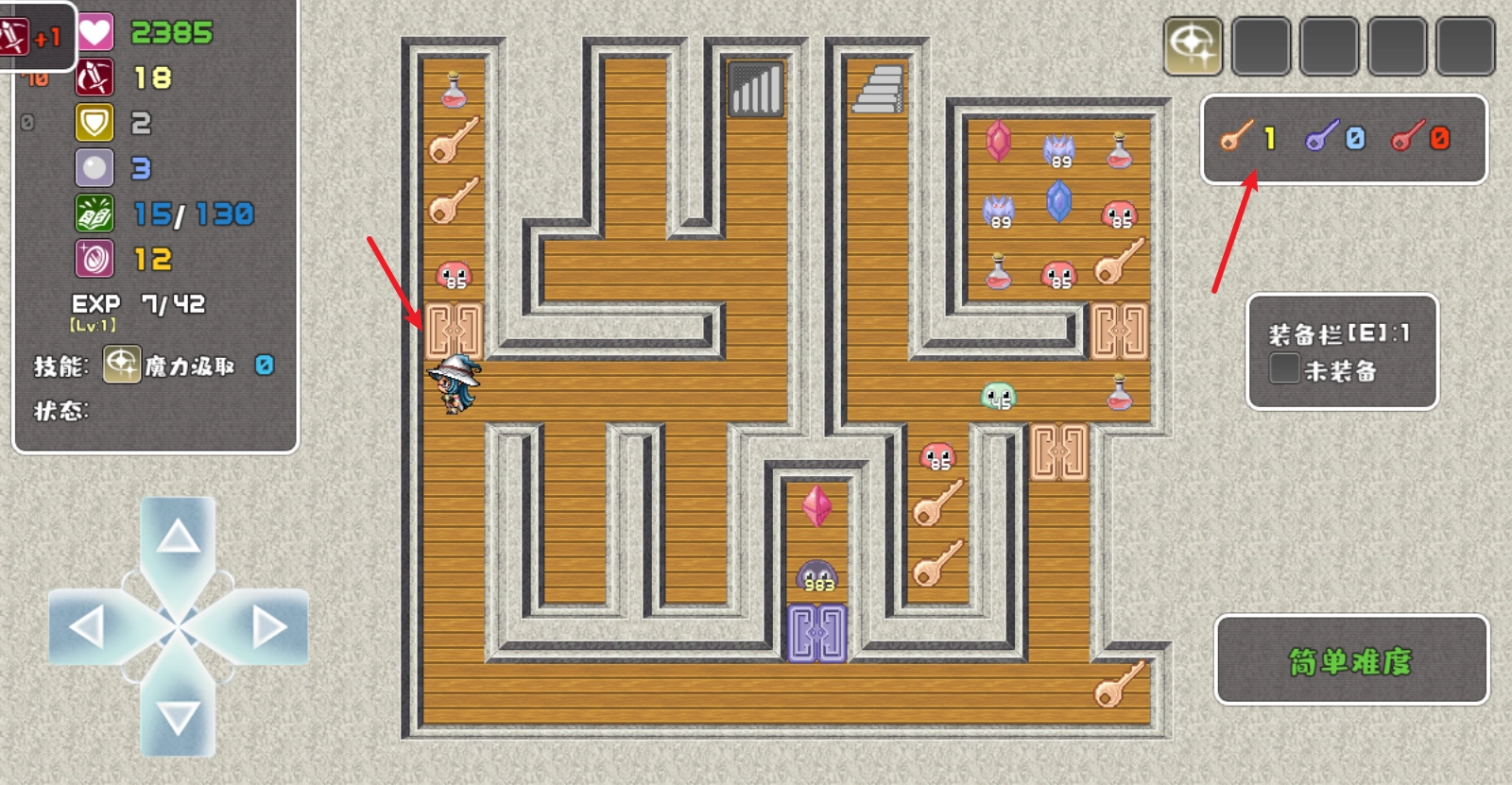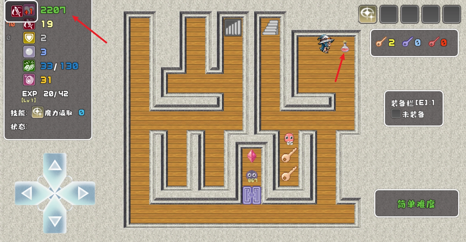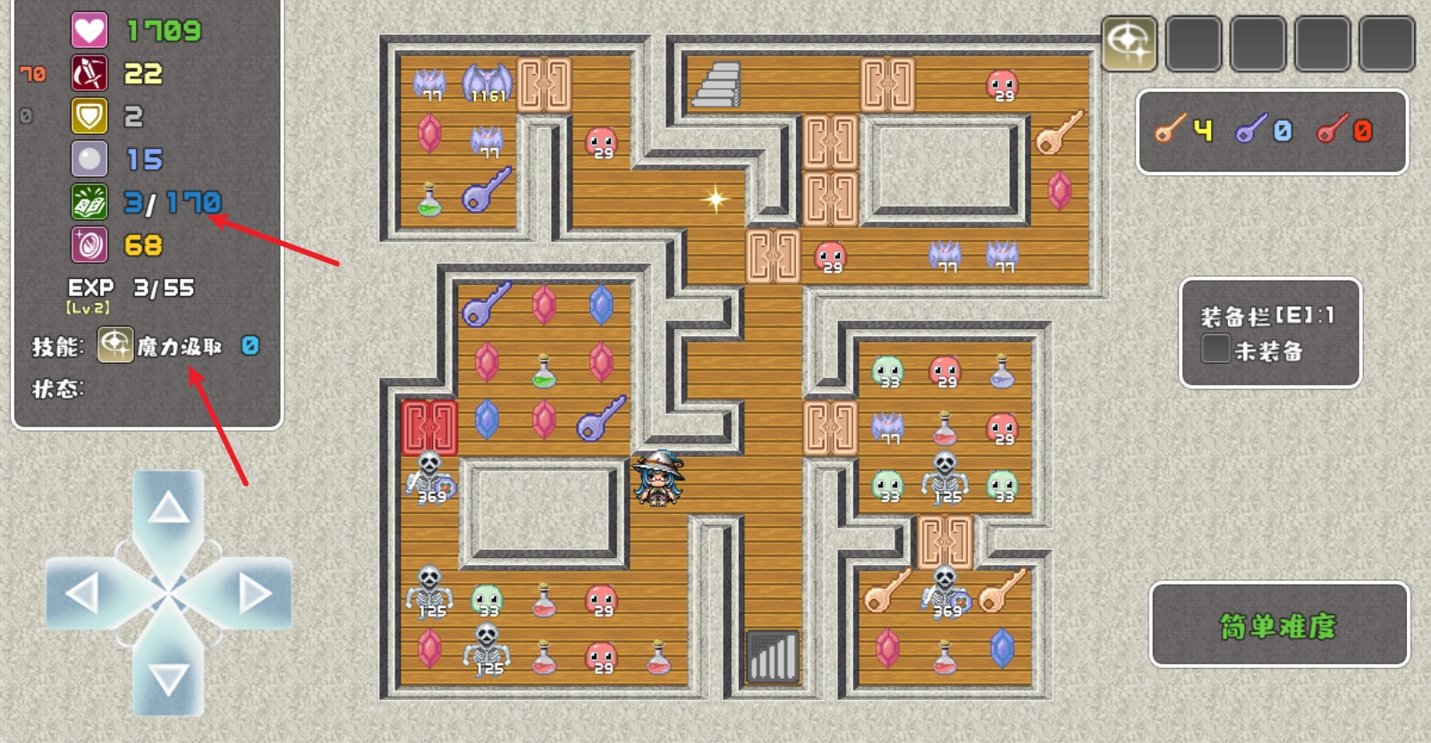 左侧可以看到自己的属性,拾取不同颜色的宝石可以提升对应属性,红色宝石增加攻击,蓝色宝石增加防御,绿色宝石可以MP和魔防值。