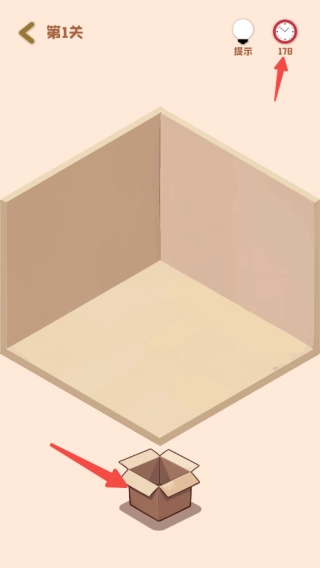 2、玩家需点击纸箱获取家具,并在规定时间内完成摆放;若遇到困难,可点击提示按钮获取相关提示。