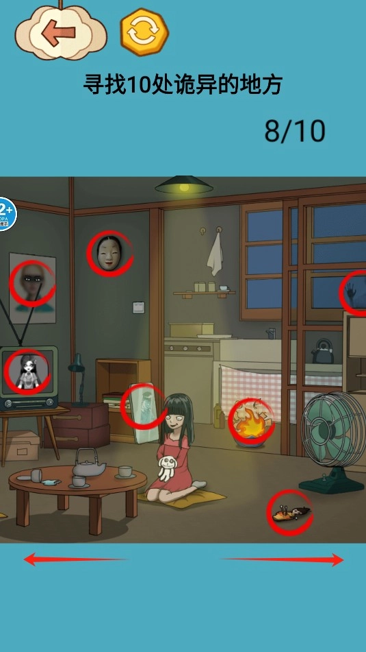 在这幅画面里,你需要找出10处诡异的地方,还能通过左右滑动画面去寻找那些隐藏的区域。