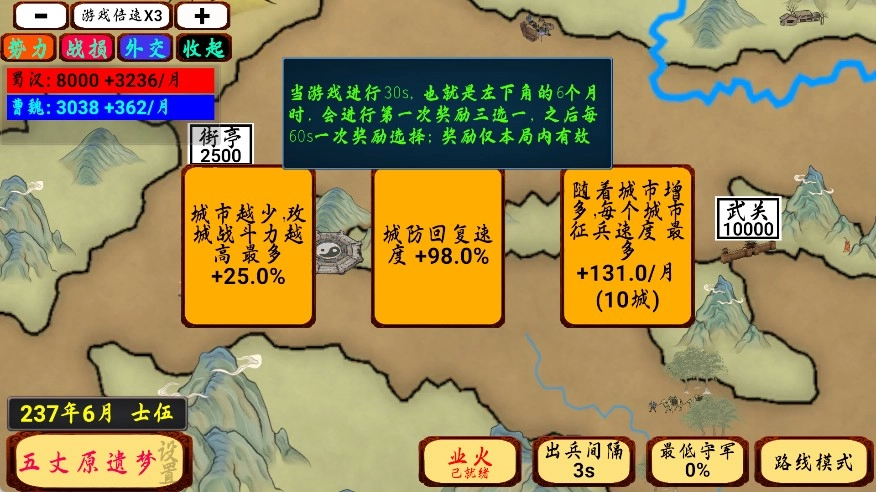 当游戏运行到30秒(即左下角显示的6个月时),会触发首次奖励三选一环节;之后每隔60秒将出现一次奖励选择机会,且所有奖励仅在本局游戏内生效。