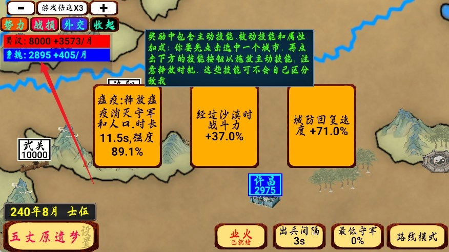 奖励里有主动技能、被动技能和属性加成。你得先点击选中一个城市,然后再点击下方的技能按钮来施放主动技能,要注意释放的时机,这些技能可不会自动区分敌我。