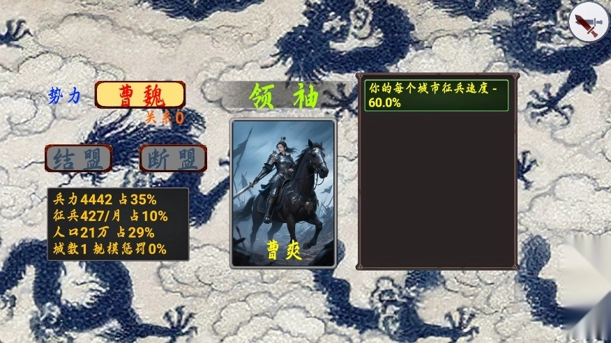点击任意城市,右上角会展示该城市的相关信息;而最右上角的势力信息区域,则会呈现更详尽的势力概况以及势力领袖的技能详情;点击右上角的剑形图标,就能回到游戏界面。
