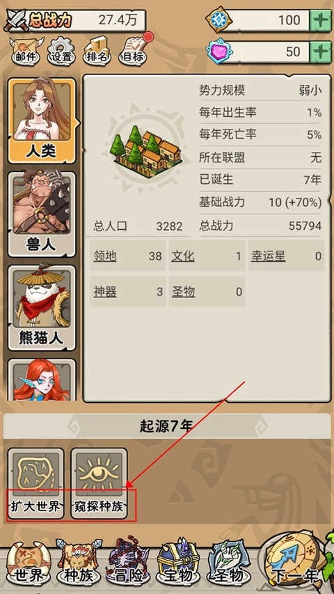 进入游戏后,玩家可点击起源下方的随机事件,以此提升种族的战力、人口等属性。