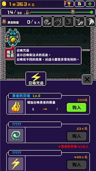 点击召唤咒语,能够解锁各类咒语,提升召唤勇者的数量。