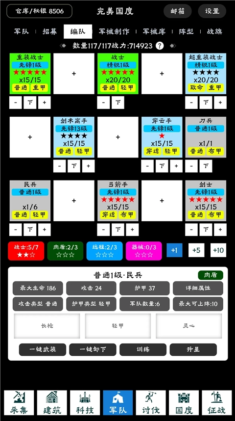 当前科技树已解锁绿色兵种,可招募绿甲战士、重装步兵,以及白刃剑士与远程弓箭手。