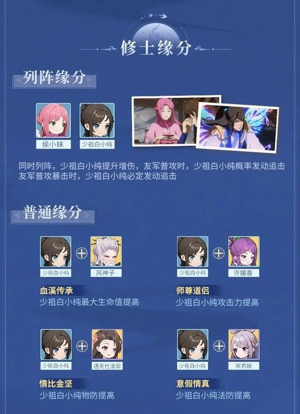 和侯小妹一同上场时,能触发列阵缘分效果,不仅能提高白小纯的伤害加成,还能解锁普攻追击的机制。这个机制的触发概率对阵容的整体强度影响很大,不管是上限还是下限表现都与之相关,比较适合用来推进主线关卡和反复挑战副本。