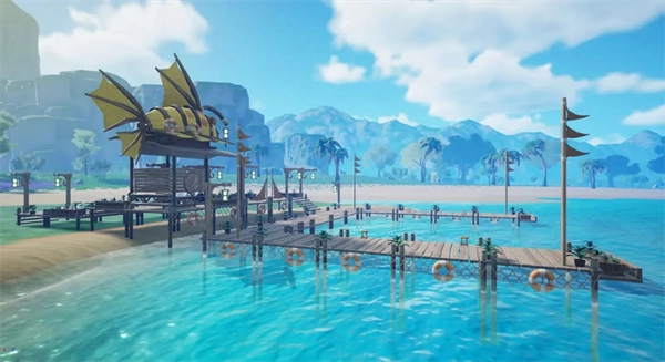 在河岸附近,有几间立着黄色标识的钓鱼小屋。小屋的栈桥上摆放着供人垂钓的板凳,靠近并互动这些板凳,就能开启钓鱼活动。