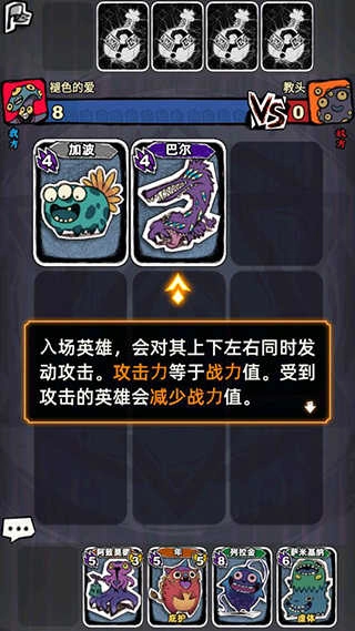 8、入场英雄会同时对其上下左右方向发动攻击,攻击力等同于自身战力值;被攻击的英雄战力值将相应减少,当战力值降至0时,该英雄会翻面并加入敌方阵营,同时恢复初始战力值。