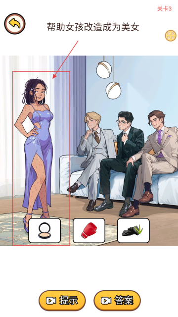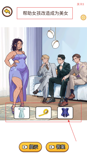 2、在【帮助女孩改造成为美女】关卡中,首先观察下方的道具,挑选合适的服饰来尝试进行改造。