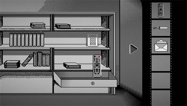 1、进入游戏后点击柜子上的书本,让所有书本浮起,获取钥匙,然后用钥匙开启柜子,获得遥控器,小刀,信。