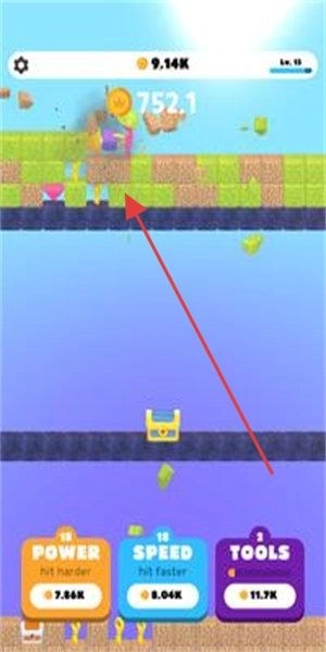 1、控制角色进行方块挖掘时,建议优先选择绿色区域(例如箭头所指向的位置),通过挖掘积累金币后,能够对【POWER】等属性进行升级,从而提升挖掘能力。