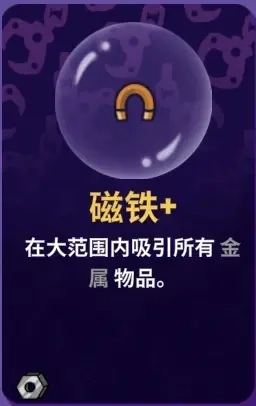 能力:第二只爪子配备了一块大磁铁,当我们单次收集的金属道具数量不少于5个时,就能增加1点攻击力。