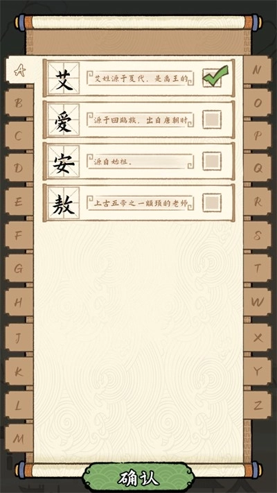 2、点击方框后会进入姓氏选择界面,你可以在此处查找自己的姓氏并开展后续操作。